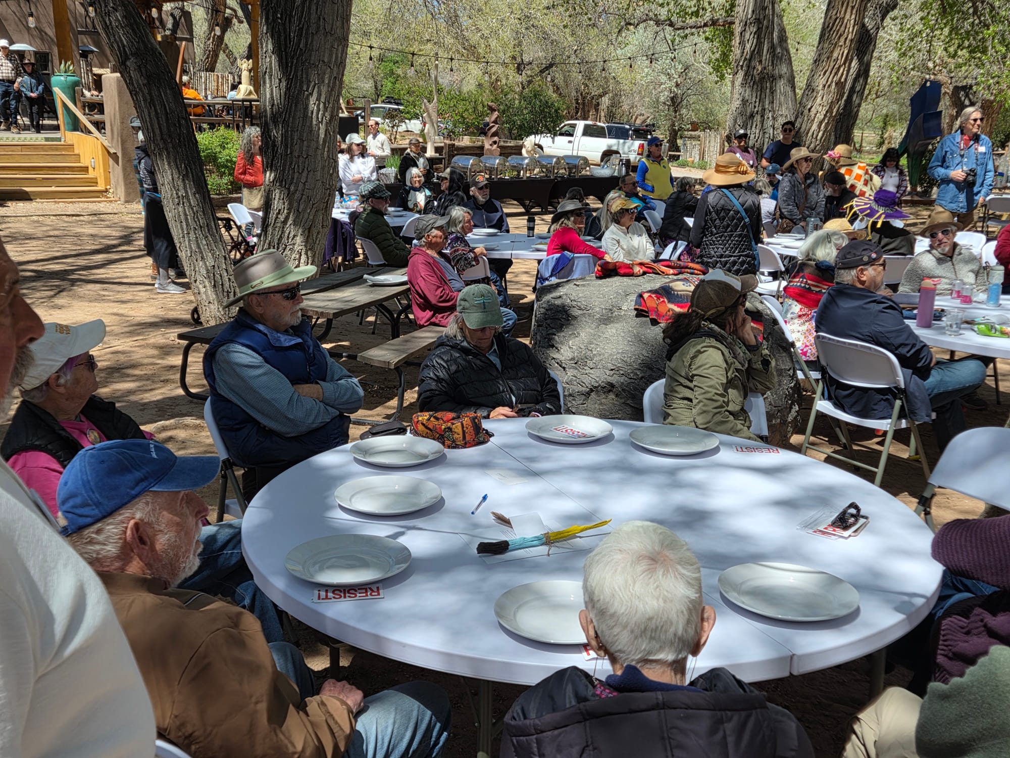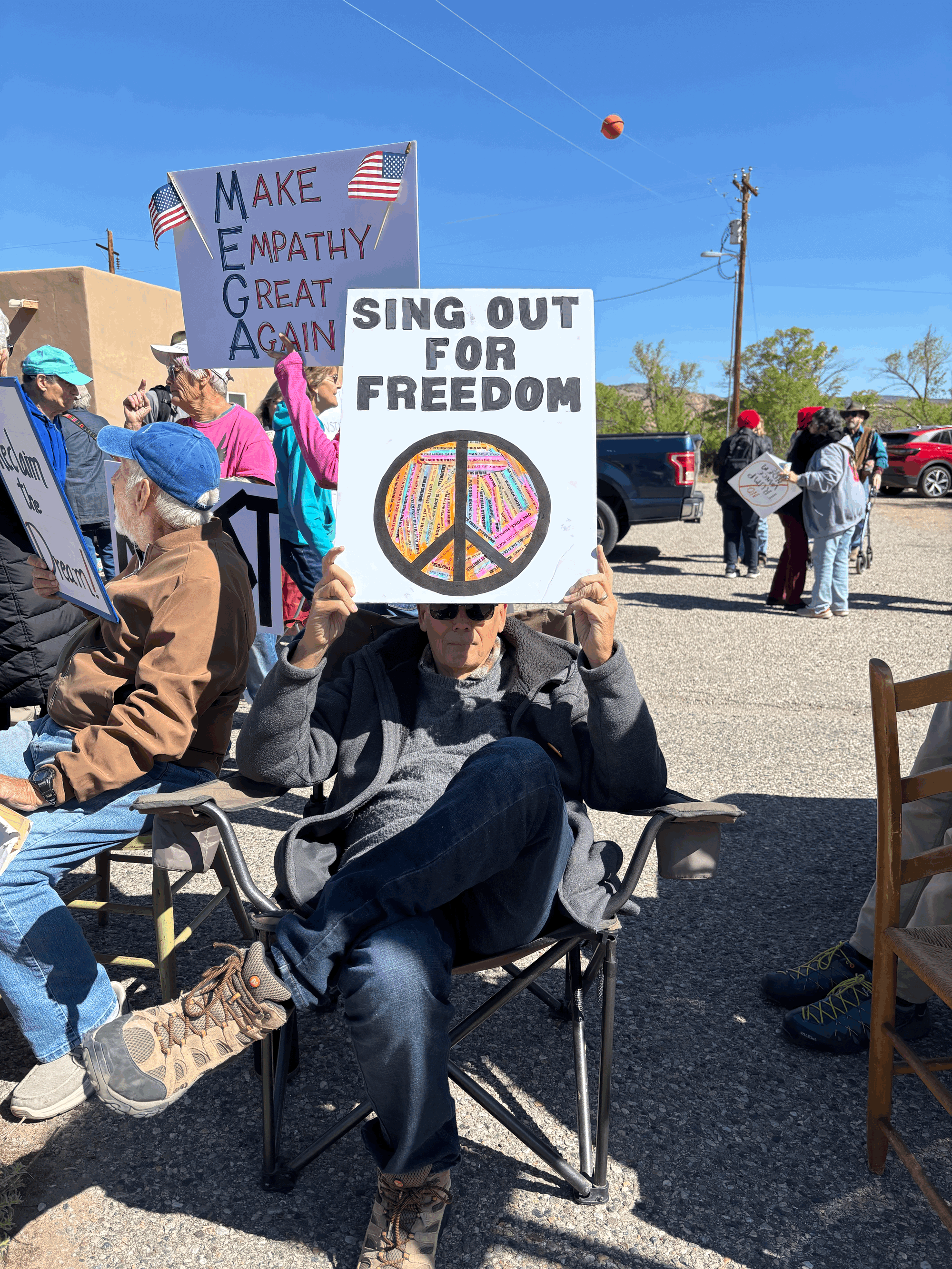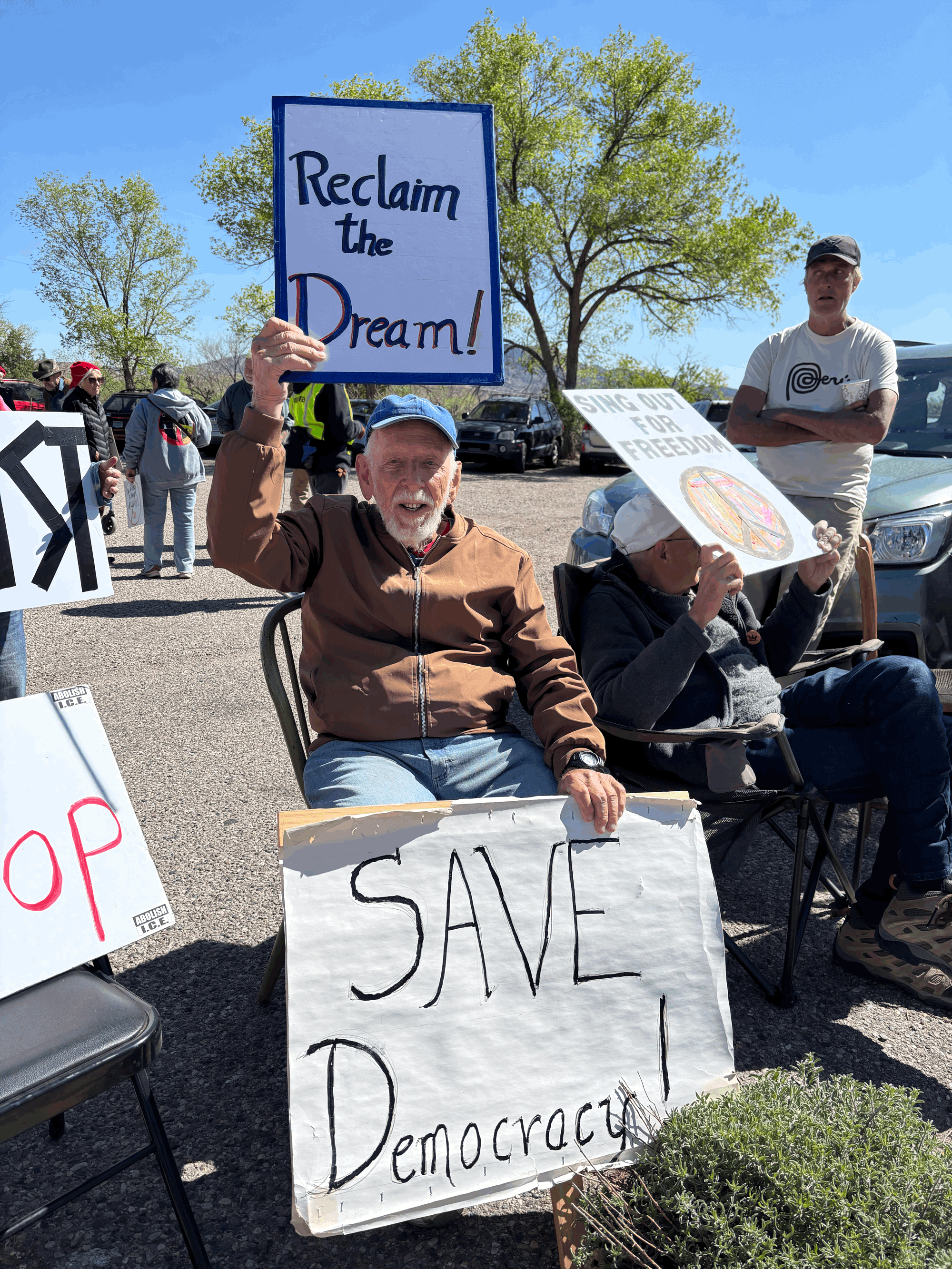 On April 18, 2026, Indivisible Abiquiu-Youngsville and Rural Indivisible New Mexico hosted Reclaiming the Dream, celebrating a year of weekly roadside activism in Abiquiu, New Mexico. Members of local Indivisible groups and other progressives from across the state gathered first to join Abiquiu-Youngsville in a rally along U.S. Highway 84 at County Road 187. Then, the group proceeded to a wonderful outdoor lunch at the Abiquiu Inn. Amidst remarks and music from the stage, the folks dining responded to a survey prepared by Phil Factor of Indivisible Abiquiu-Youngsville, who asked Heidi Li Feldman, founder of Land of Action, to collate the results and share them here.