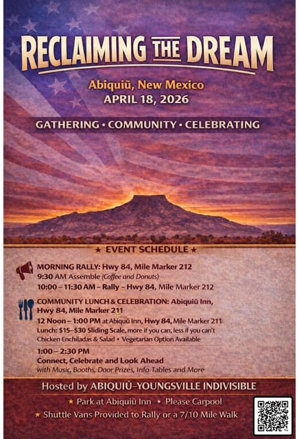 Abiquiu-Youngsville Indivisible and Rural Indivisible New Mexico are holding a rally and luncheon in Abiquiu on April 18, 2026.